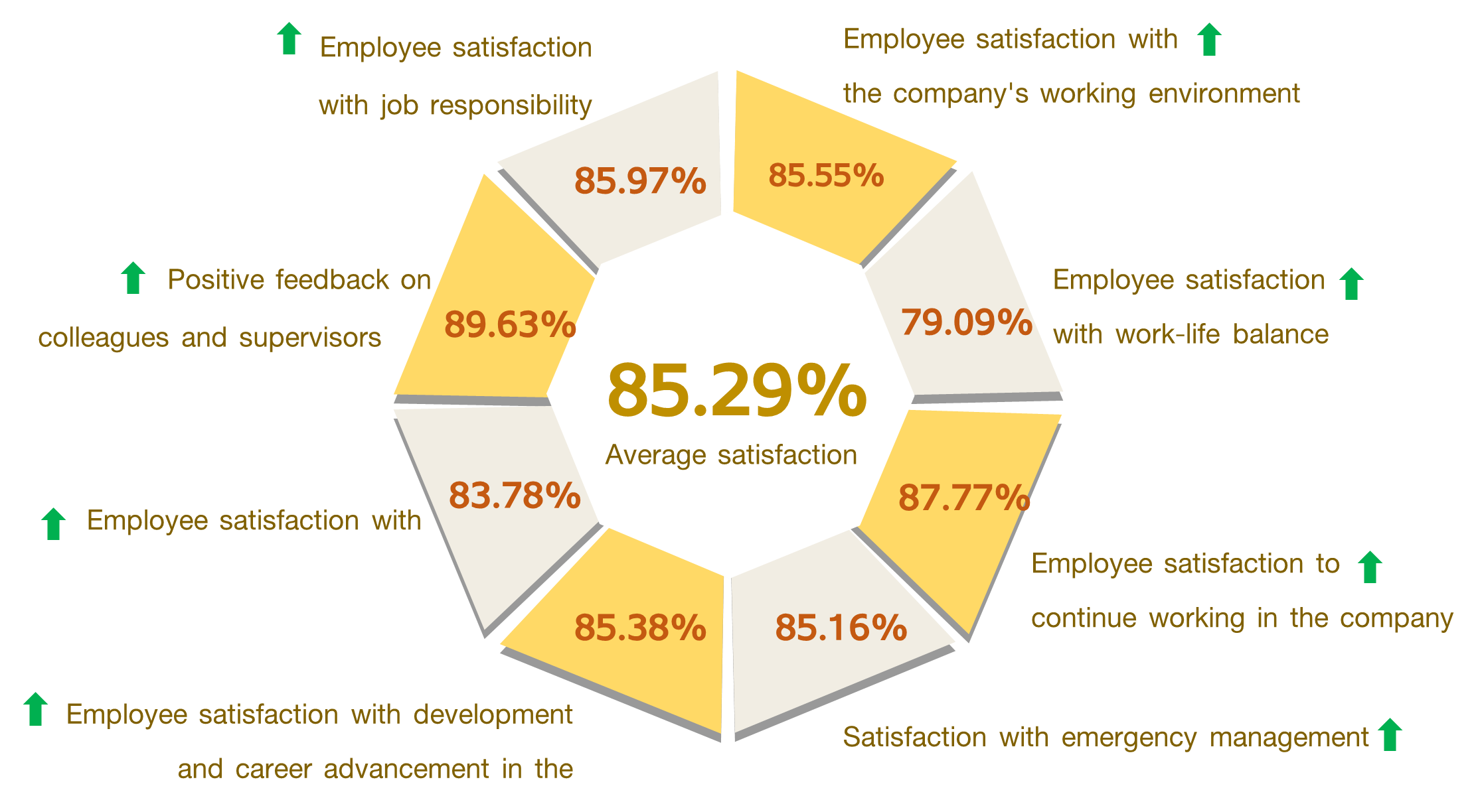 The company conducts an annual employee satisfaction survey. In 2023, the company surveyed 15,929 employees, and 11,146 employees responded, representing 69.97% of all employees. In 2024, the average employee satisfaction level was 85.29%, with satisfaction increasing in all aspects. The highest satisfaction was found in positive feedback towards colleagues and supervisors, with a satisfaction level of 89.63%. Following this was satisfaction in continuing to work with the company, with a level of 87.77%. The company set a satisfaction target of no less than 80%, which exceeded the set goal. However, in terms of work-life quality, the evaluation results were slightly below the standard. We will communicate these survey results to employees, acknowledge them, and develop operational processes to further improve employee satisfaction. This includes implementing projects to promote work-life quality for employees, conducting Growth Mindset training to enhance employees' understanding of their work, and organizing activities to relieve work-related stress, such as sports competitions and social gatherings, as opportunities arise.
