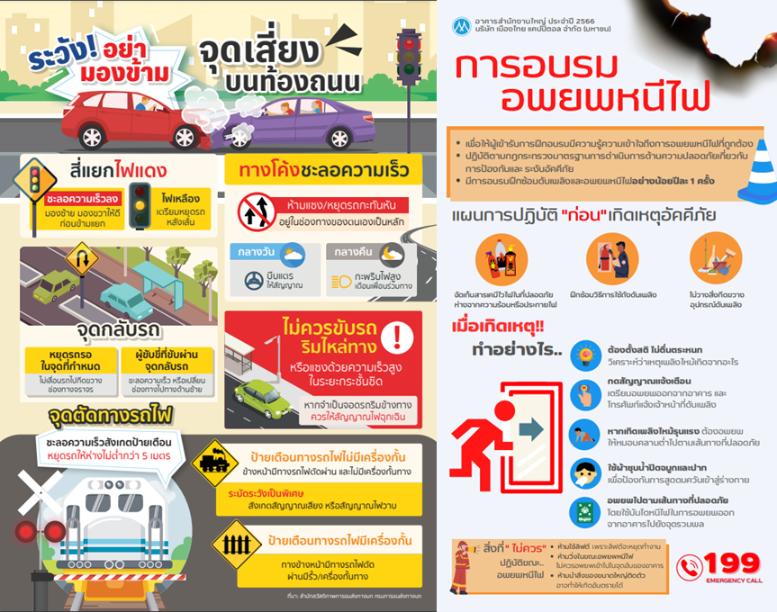 The company places great importance on the safety of employees' lives and assets. To ensure this, the company supports safety training programs in compliance with safety measures and conducts awareness campaigns on safe driving through the intranet system (MTCU). These initiatives serve as reminders for employees to be aware of the importance of safety, driving carefully, and avoiding negligence that could lead to harm to themselves or others, potentially causing damage to lives and property.