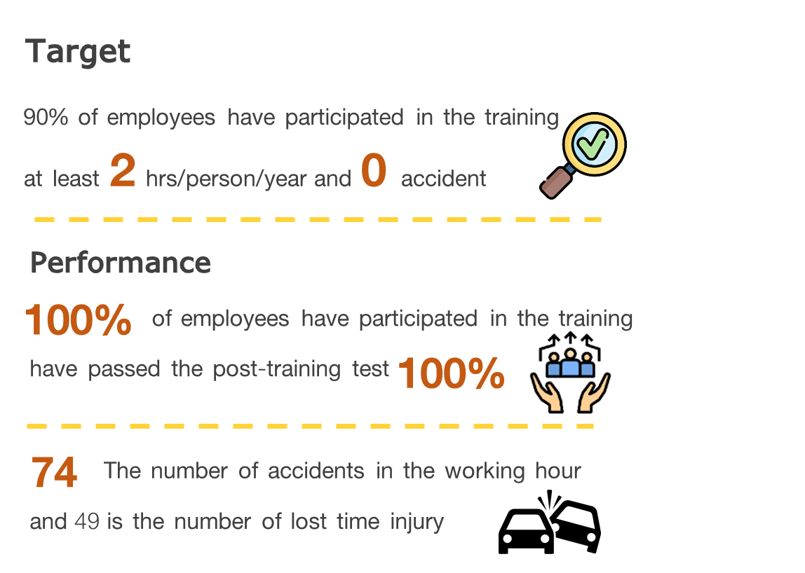 - The company promotes skills and educates employees on the importance of safety, occupational health, and working environment by organizing safety training and conducting fire evacuation drills for employees on a regular basis.