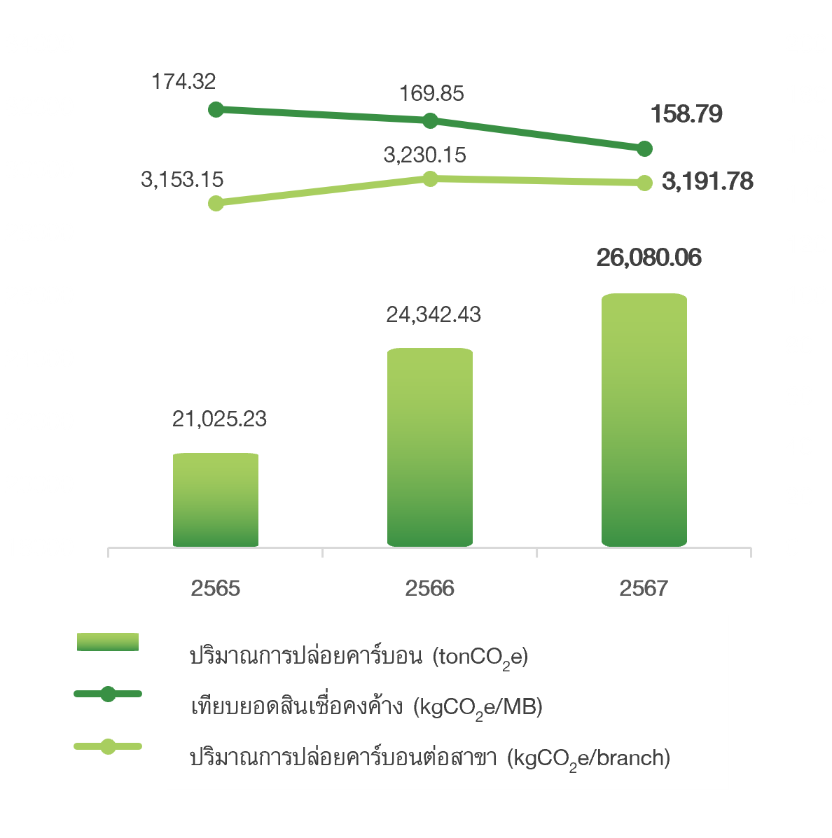 บริษัทฯ กำหนดตัวชี้วัดสำหรับวัดค่าประสิทธิภาพการดำเนินการหรือค่าความเข้มข้นของการปล่อยก๊าซเรือนกระจก (Intensity) คำนวณได้จากปริมาณการปล่อยคาร์บอนไดออกไซด์เทียบเท่าต่อยอดสินเชื่อคงค้าง (ตันคาร์บอนไดออกไซด์เทียบเท่า/ล้านบาท) โดยกำหนดให้ Intensity ลดลงมากกว่า 10% หรือ ประมาณ 4,073 tonCO2e เมื่อเทียบจากปีก่อนหน้า และกำหนดให้เป็นหนึ่งในดัชนีชี้วัดความสำเร็จ (KPI) ขององค์กร ทั้งในระยะสั้นและระยะยาว